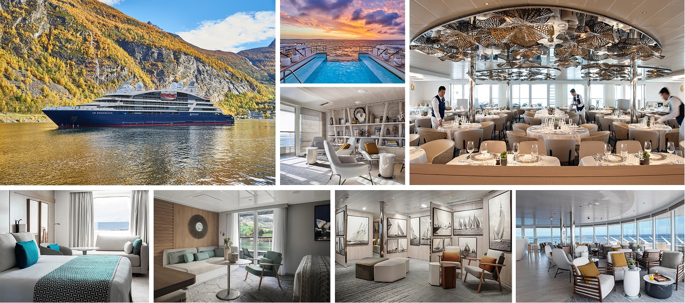 The five-star Le Champlain, part of the PONANT Explorers expedition yacht series, features 92 cabins accommodating 184 guests. Designed with advanced eco-friendly technology, its “Clean Ship” certification highlights energy efficiency and marine protection. Compact yet luxurious, it navigates shallow bays and sensitive environments while offering safe, comfortable voyages with custom stabilizers. (7 nights)